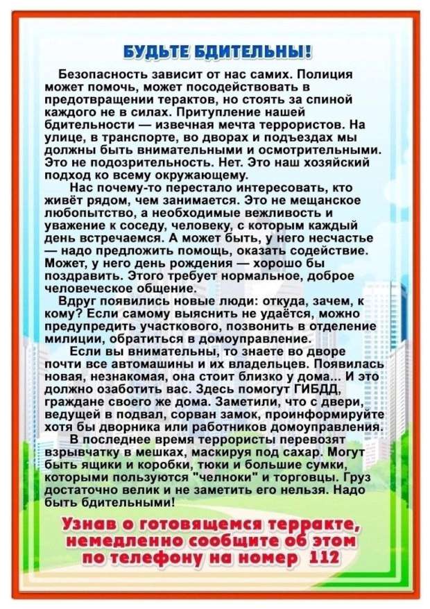 - Если узнали о возможном теракте, сразу сообщите об этом в правоохранительные органы!